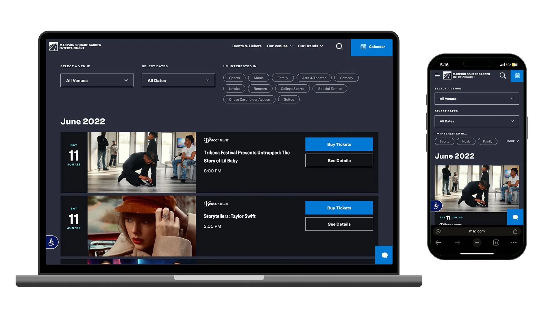 For four years I led the charge on the UI/UX design front for msg.com, the main site for Madison Square Garden Arena and its sister venues The Theater at MSG, Radio City Music Hall, The Beacon Theatre and The Chicago Theatre.